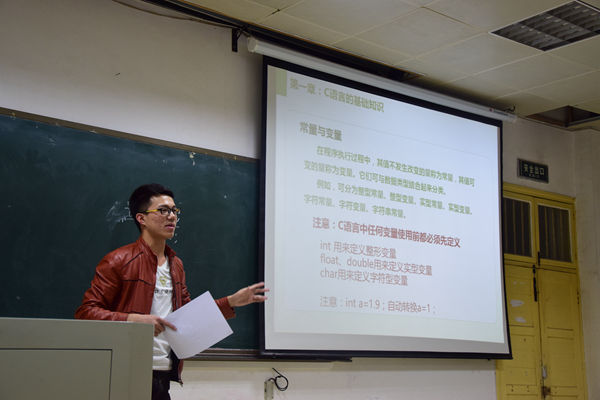 为帮助新生了解C语言,提高yl23411集团官网学生计算机二级考试通过率,2016年11月1日晚7:00,由yl23411集团官网科技协会举办的第二届C语言培训班在十教附一202成功开课。学工办吴秋霜老师、团委副书记彭亚平莅临了本次C语言培训班开课仪式。科技协会副部长潘少鹏为主讲人。