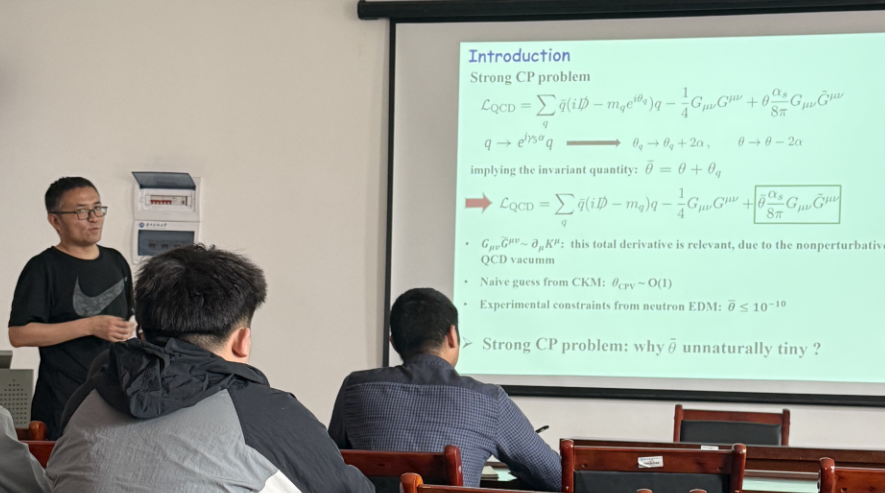 郭志辉教授以" Probe of Axion Dynamics in Chiral Effective Field Thoery"为主题展开学术分享。他从解决强CP问题的轴子粒子切入,系统阐述该理论在粒子物理、宇宙学等多学科领域的重要价值。通过结合手征有效场论、格点QCD及强子现象学的研究方法,详细解析了轴子与轻味强子相互作用的动力学机制,并着重展示了该领域在轴子-介子振幅计算方面的最新突破。报告过程中,郭教授通过构建理论框架与实验数据的深度对话,生动展现了基础物理理论对实验研究的指导意义。在互动环节,他更结合自身科研经历,就理论物理研究范式创新、多学科交叉融合等话题与师生展开深入探讨。